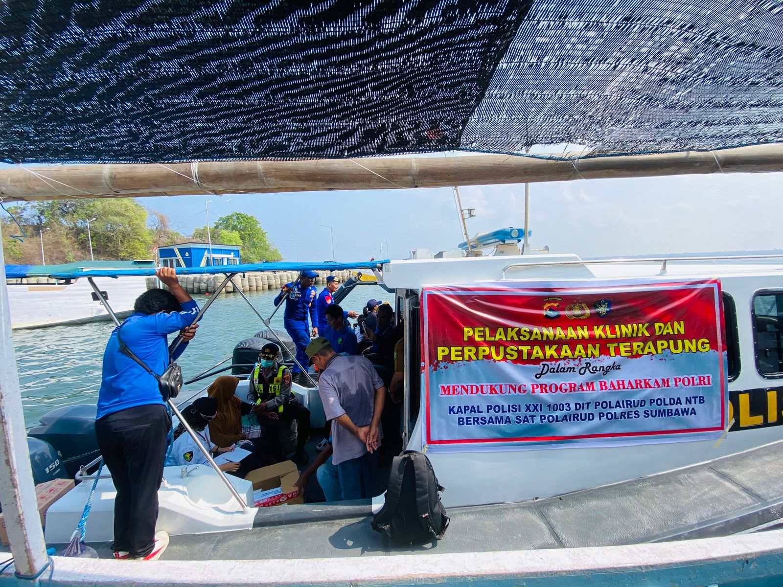 Sumbawa Besar-NTB, Satpolairud Polres Sumbawa menggelar kegiatan perpustakaan dan klinik terapung yang berlokasi di Pelabuhan Pantai Goa Kecamatan Labuhan Badas, Sumbawa, Selasa (12/11) pagi.