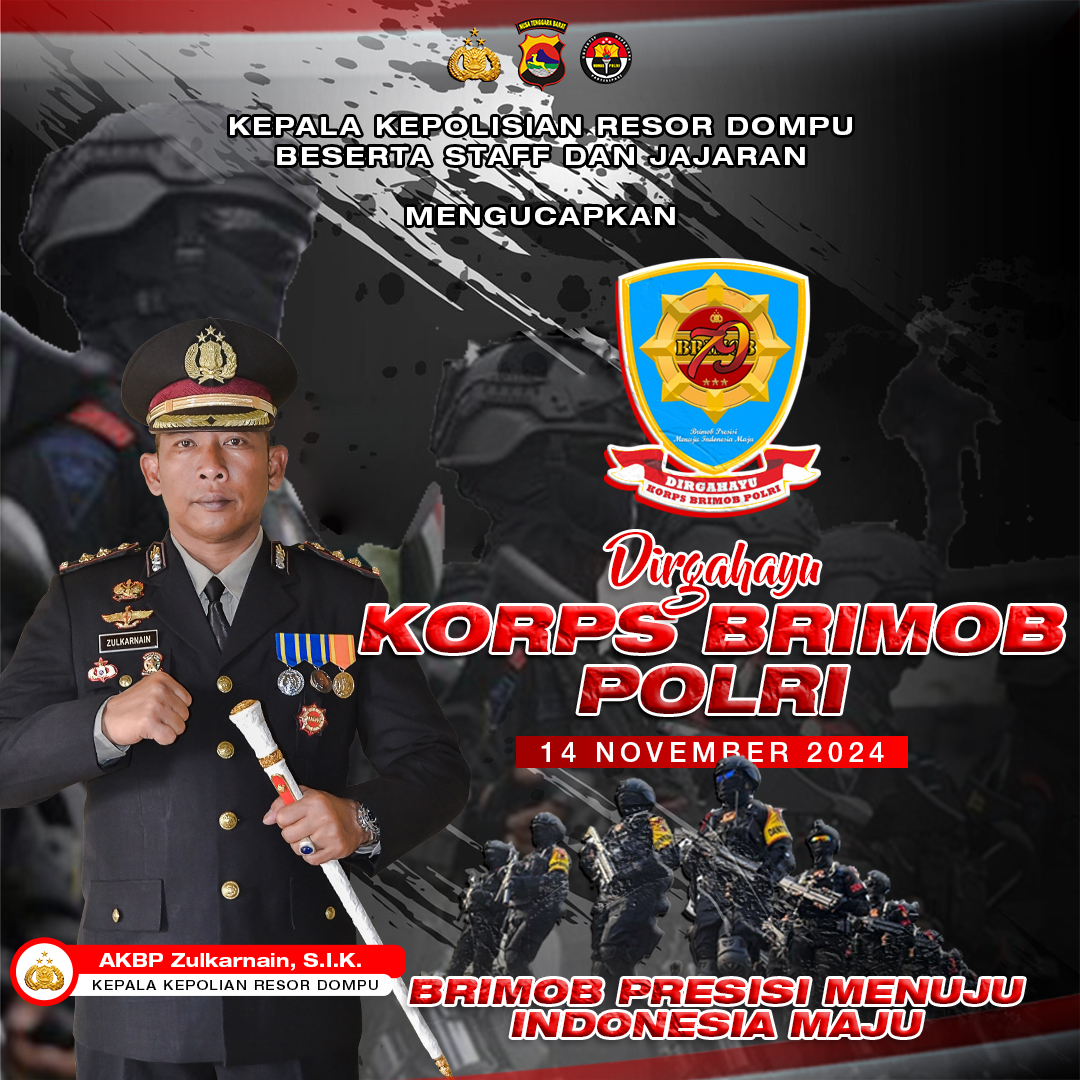Kapolres Dompu, AKBP Zulkarnain, S.I.K., beserta seluruh jajaran Polres Dompu, turut mengucapkan selamat Hari Ulang Tahun ke-79 kepada Korps Brigade Mobil (Brimob) Polri yang diperingati pada tanggal 14 November 2024. Ucapan ini disampaikan sebagai bentuk apresiasi dan penghormatan terhadap pengabdian Brimob dalam menjaga keamanan, ketertiban, dan keutuhan NKRI.