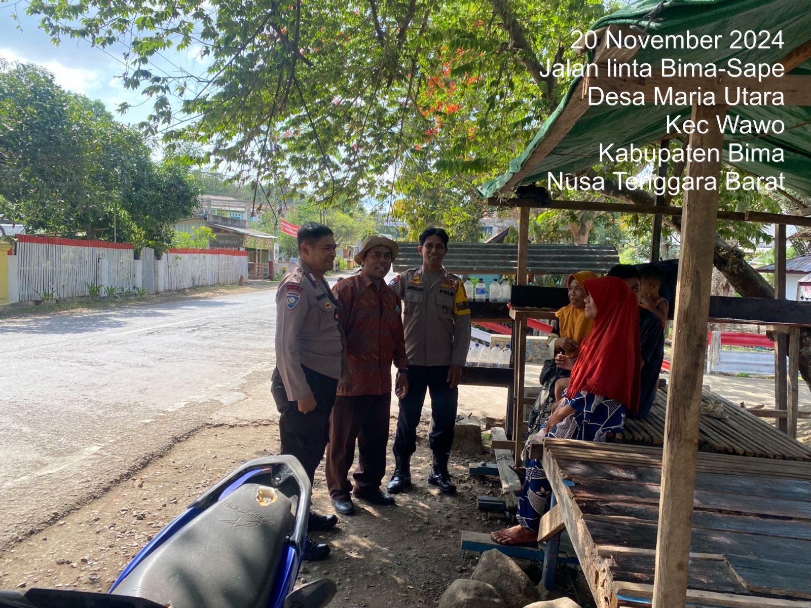 Bima, NTB (21 November 2024) – Dalam rangka menjaga situasi keamanan dan ketertiban masyarakat (Kamtibmas) menjelang tahapan pungut hitung Pemilihan Kepala Daerah (Pilkada) Serentak Tahun 2024, Polsek Wawo yang tergabung dalam Operasi “Mantap Praja Rinjani 2024” melaksanakan patroli dan memberikan imbauan Kamtibmas di Desa Maria Utara, Kecamatan Wawo, Kabupaten Bima, pada Rabu pagi (20/11/2024).