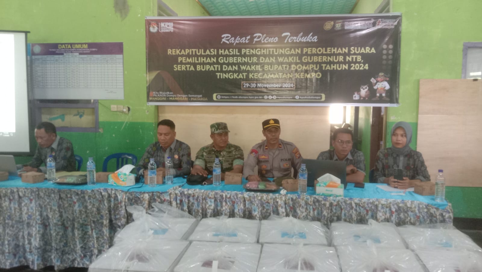 Rapat pleno dihadiri oleh Panitia Pemilihan Kecamatan (PPK) Kempo, saksi dari pasangan calon, Panwaslu Kecamatan, dan aparat keamanan dari Polsek Kempo serta Koramil Kempo. Dengan pengamanan yang ketat, situasi selama kegiatan berlangsung dalam keadaan tertib, aman, dan kondusif.