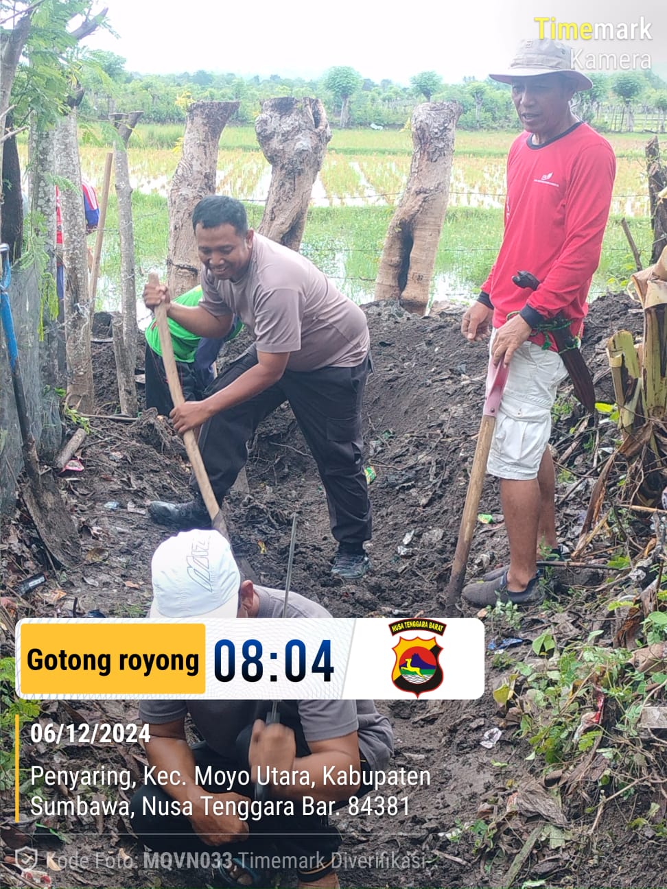 Sumbawa Besar –NTB, Bhabinkamtibmas Polsek Moyo Hilir AIPDA Edi Susilo, melaksanakan kegiatan gotong royong bersama masyarakat Desa Penyaring, Kecamatan Moyo Utara, pada Jumat (6/12/2024) pagi.