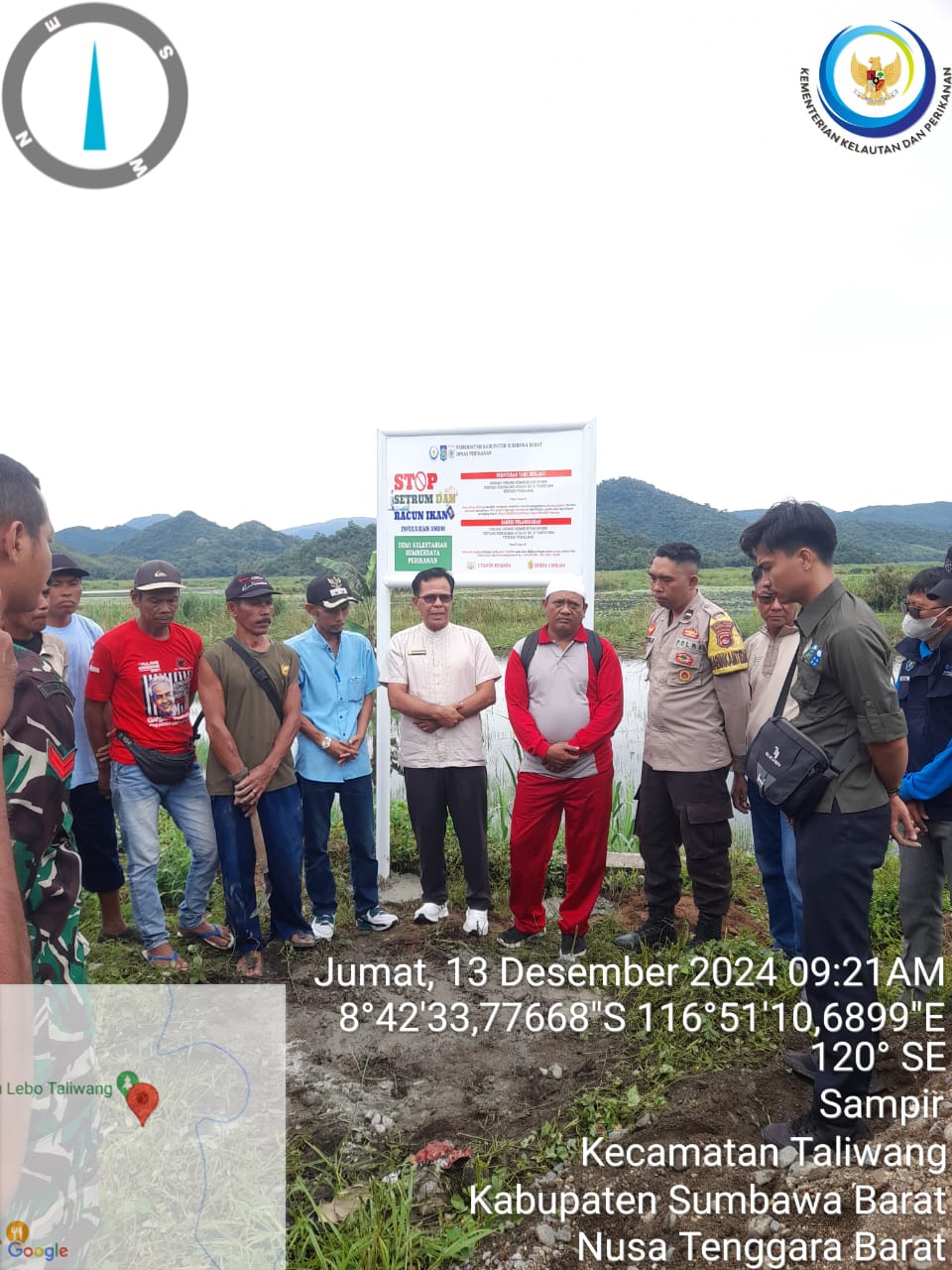 Sumbawa Barat NTB – Bhabinkamtibmas Kelurahan Sampir Polsek Taliwang Aipda Supriadi Suta Wijaya bersama tiga pilar Lurah dan Babinsa Kelurahan Sampir mendampingi Kepala Dinas Pertanian memasang larangan penangkapan ikan di Lebo ( Danau) dengan cara menggunakan aliran listrik, Jumat 13/12/2024.