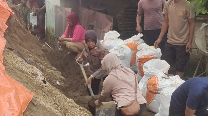 Menanggapi hal tersebut Kapolsek Gangga Iptu Henni Andriani, SH., turun langsung ke lokasi bersama anggota dan warga bergotong royong membersihkan tanah sisa longsor.