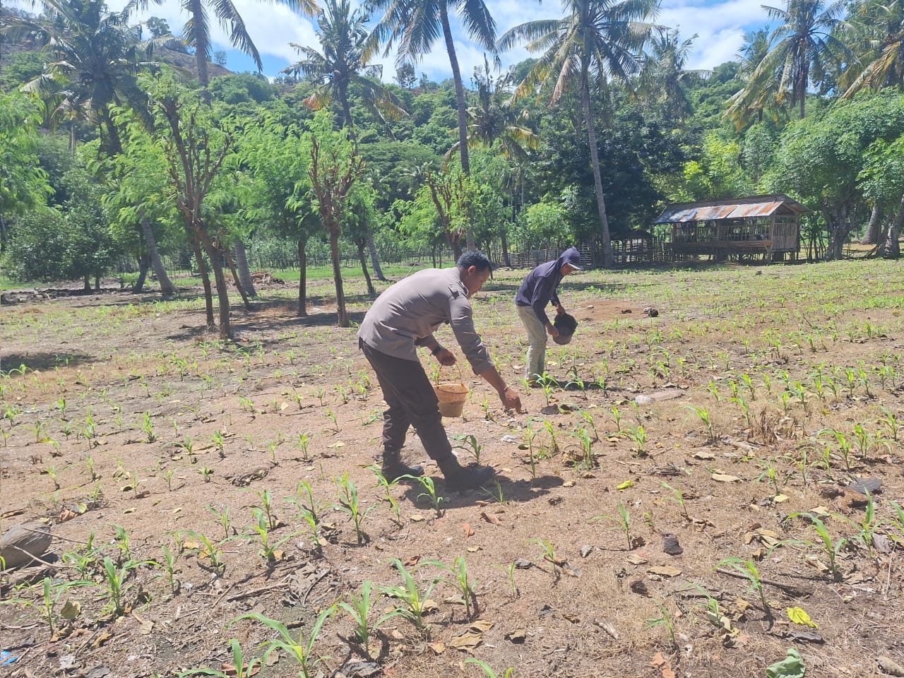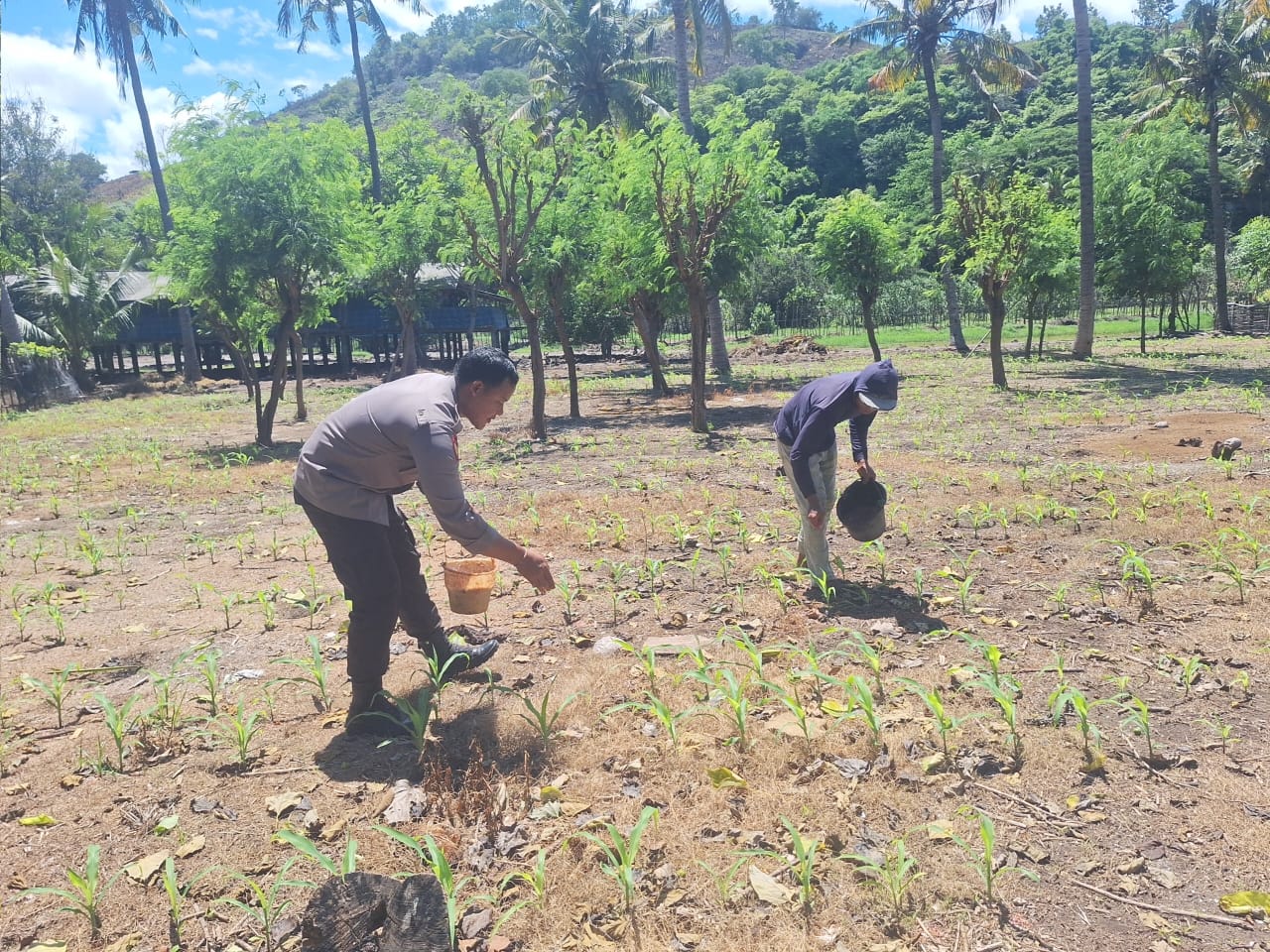 Dalam kegiatan tersebut, Bhabinkamtibmas tidak hanya menyapa warga, tetapi juga turun langsung membantu petani dalam memupuk tanaman jagung yang mulai tumbuh. Kegiatan ini mencerminkan peran aktif polisi dalam mendukung sektor pertanian yang menjadi salah satu pilar ketahanan pangan.