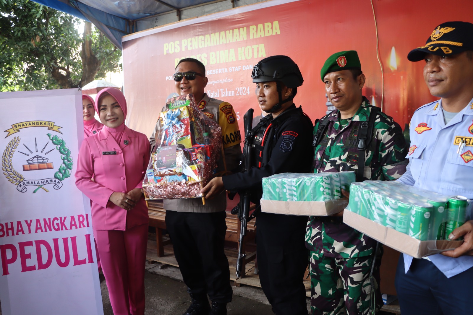Kota Bima, NTB (29/12) – Sebagai bentuk apresiasi dan dukungan kepada personel yang bertugas dalam Operasi Lilin Rinjani 2024, Kapolres Bima Kota AKBP Yudha Pranata, S.I.K., S.H., bersama Ketua Bhayangkari Cabang Bima Kota Diah Yudha Pranata serta jajaran pengurus Bhayangkari, Waka Polres Kompol Herman, S.H., dan Pejabat Utama (PJU) Polres Bima Kota, memberikan bingkisan kepada personel di Pos Pengamanan (Pospam) dan Pos Pelayanan (Posyan).
