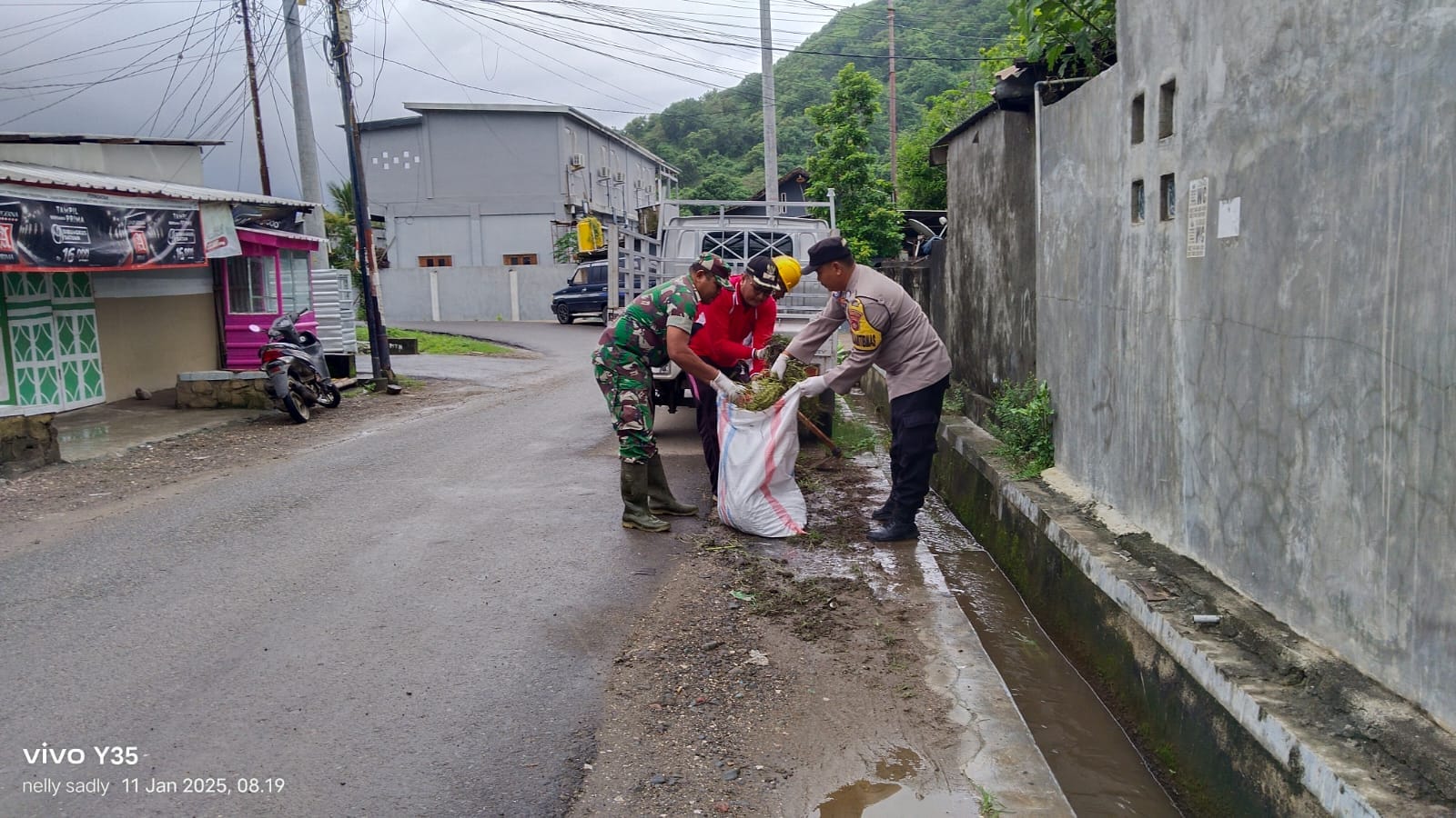 “Pada musim hujan ini sangat diperlukan kebersamaan langkah antara Pemerinrah Desa, Bhabinkamtibmas dan Babinsa serta partisipasi masyarakat untuk bersama – sama melakukan Gotong Royong, terutama pada saluran air ( drainase) agar tidak ada sumbatan yang mengakibatkan luapan air saat hujan tiba” tutur Kasi Humas.