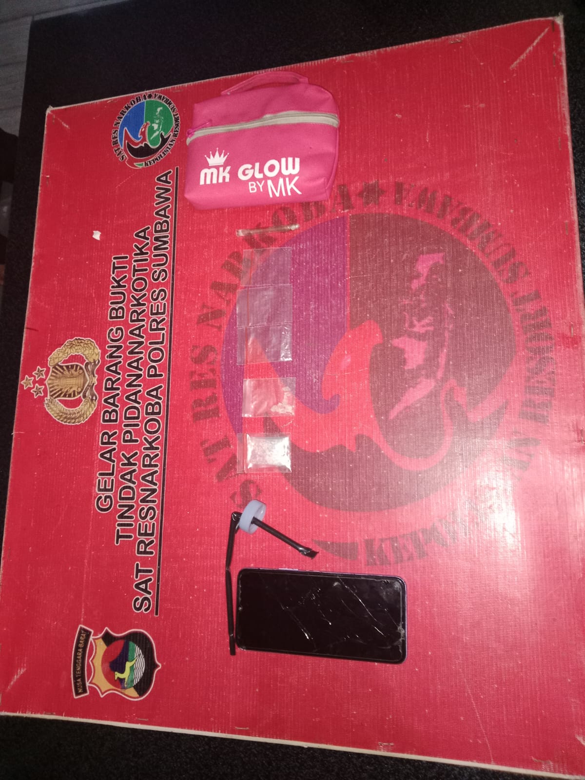 Sejumlah barang bukti yang ditemukan diantaranya 2 poket narkotika yang diduga jenis sabu dengan berat bruto 1,95 gram, 3 poket klip obat kosong, 1 buah tas kecil berwarna pink, 1 buah pipa kaca, 1 buah tutup bong dan 1 unit hp android.