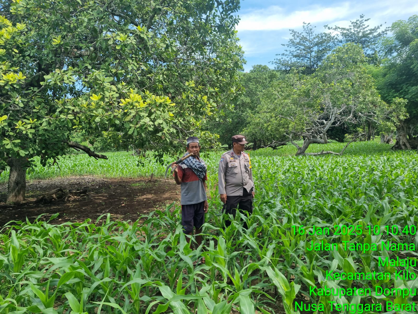 Sebagai bentuk dukungan terhadap Program Ketahanan Pangan Nasional menuju Indonesia Emas 2024, Bhabinkamtibmas Desa Kadindi Barat, Polsek Pekat, BRIPTU Feri Mandala Putra, melakukan pemantauan langsung terhadap lahan pertanian jagung milik Syarifuddin di Dusun Kaliaga II, Desa Kadindi Barat, Kecamatan Pekat, Kabupaten Dompu. Kegiatan ini berlangsung pada Jumat, 17 Januari 2024, pukul 14.20 WITA hingga selesai.