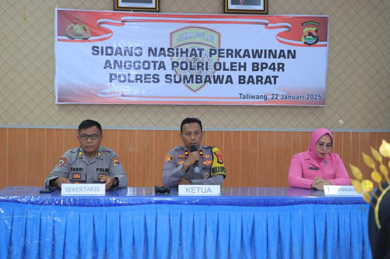 Sumbawa Barat NTB – Badan Pembantu Penasehat Perkawinan Perceraian dan Rujuk (BP4R) Polres Sumbawa Barat menggelar sidang pra nikah , bagi anggota Polri dan calon pasangannya yang akan melangsungkan pernikahan,, sidang berlangsung di Aula Endra Dharma Laksana Polres Sumbawa Barat Rabu, 22 Januari 2025.