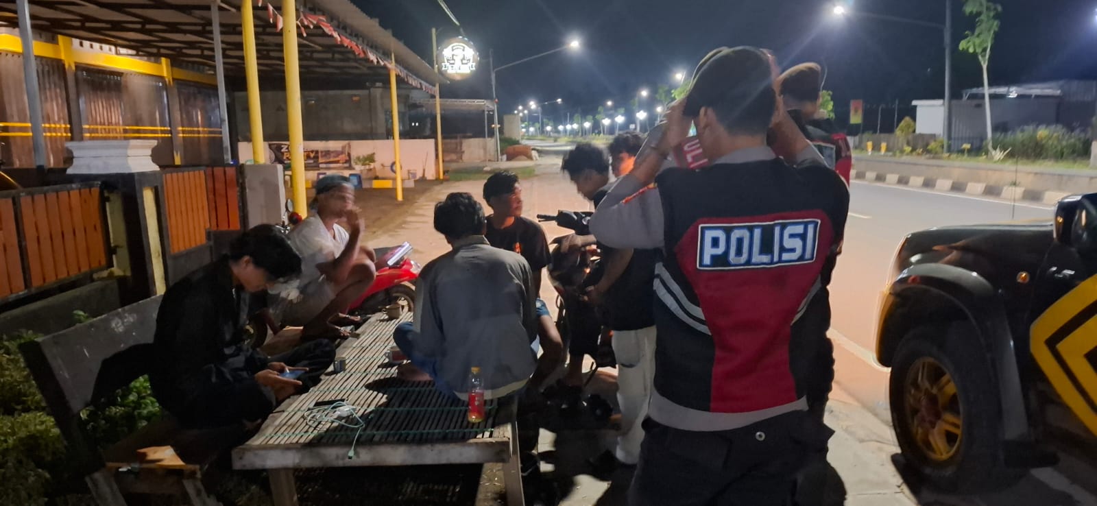 Petugas patroli menemui para pemuda yang masih bergerombol nongkorong di pinggir jalan karena sudah larut malam. Untuk mengantisipasi potensi gangguan Kamtibmas, akhirnya polisi melakukan pengecekan kendaraan serta pemeriksaan apabila membawa senjata tajam kepada para pemuda tersebut.