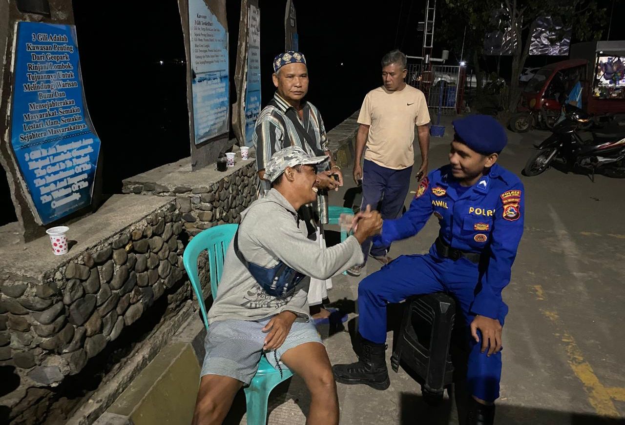 Dalam upaya menciptakan situasi yang aman serta kondusif di wilayah pelabuhan bangsal serta daerah pesisir pantai bangsal, satuan Polair laksanakan patroli dialogis dengan masyarakat sekitar pelabuhan bangsal.