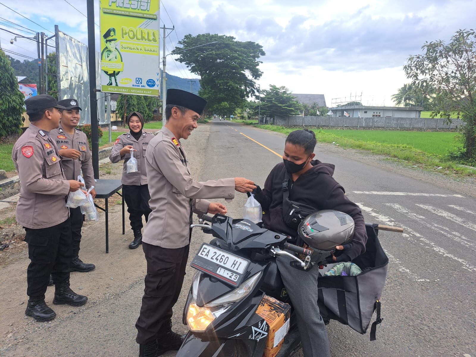 Pembagian takjil menyasar kepada pengguna jalan di jalan raya depan Mapolres Sumbawa Barat yang dikoordinir oleh Kabag Logistik, AKP Hasanuddin, bersama anggota Polres Sumbawa Barat.