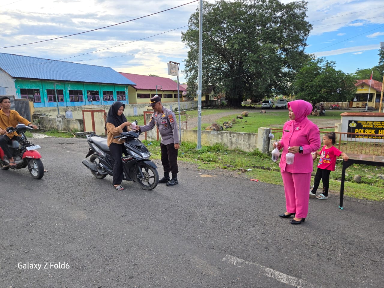 Sore itu, langit mulai meredup, pertanda senja akan segera tiba. Angin sepoi-sepoi menyapu jalan raya Lintas Lakey, tempat di mana sekelompok orang berseragam biru dan beberapa perempuan berkerudung rapi berdiri dengan senyum penuh kehangatan. Mereka bukan sekadar petugas keamanan atau pendamping setia, tetapi juga sahabat bagi masyarakat yang mereka lindungi.