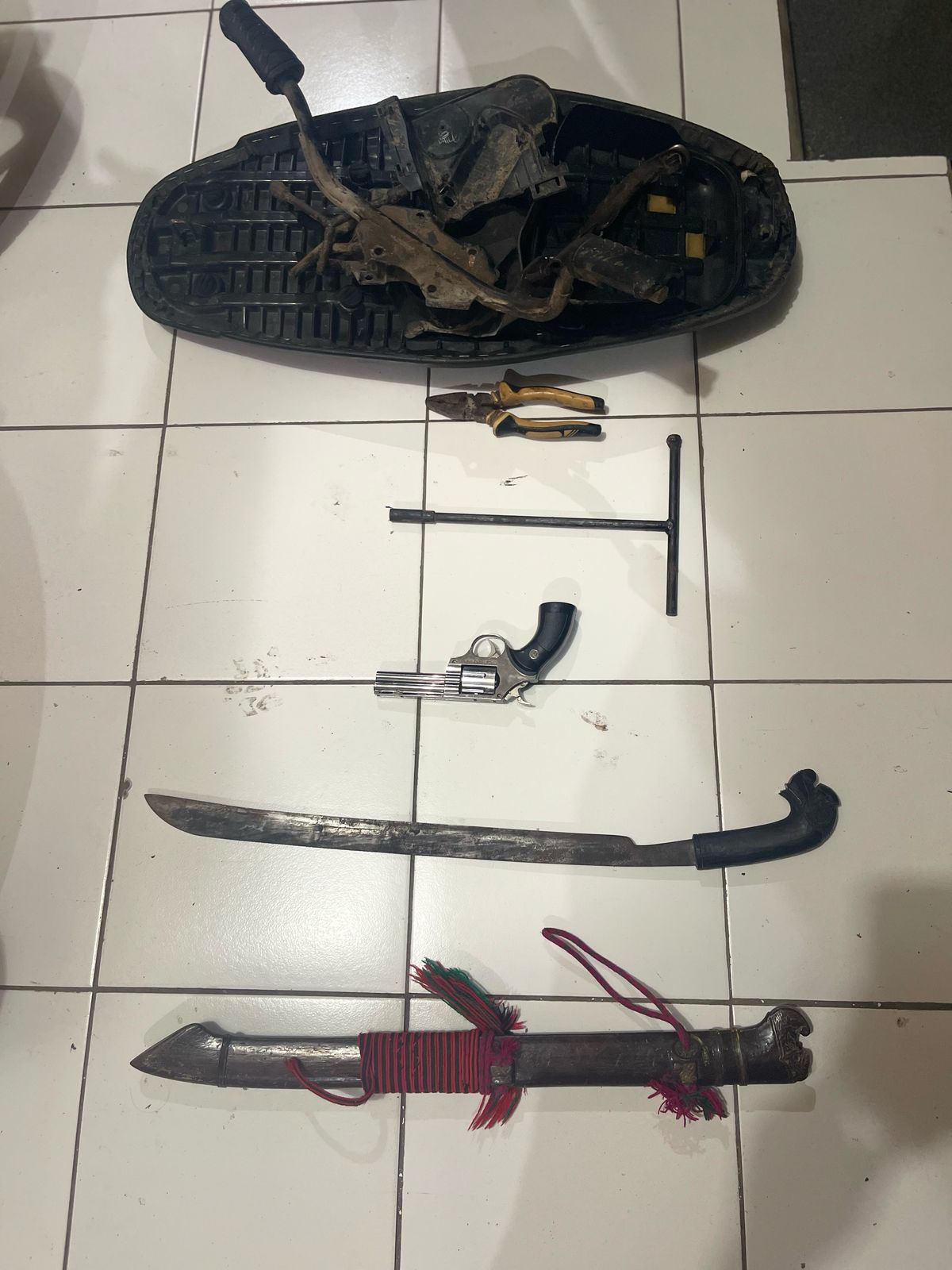 Dari tangan para pelaku, petugas berhasil mengamankan sejumlah barang bukti, yaitu 1 unit sepeda motor Honda Supra X 125, 1 unit sepeda motor Yamaha Jupiter MX 135, 1 buah parang panjang, dan 1 buah korek api model senjata api.