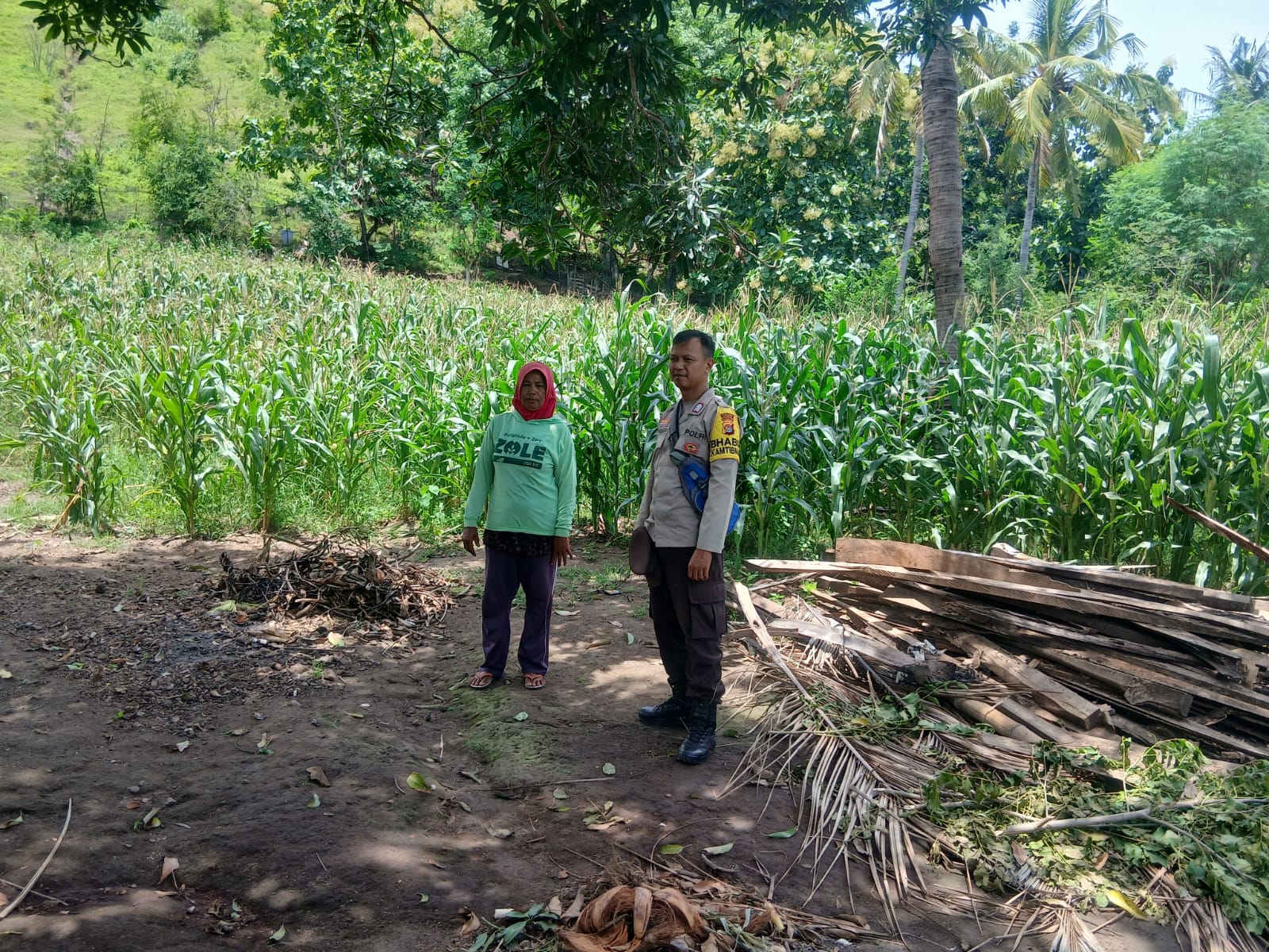 Bhabinkamtibmas (BKTM) Desa Mbuju, Bripka Dimas Sanjaya Putra, melaksanakan pemantauan lahan pertanian milik warga binaan di Dusun Matompo, Desa Mbuju, Kecamatan Kilo, Kabupaten Dompu, Sabtu (15/03/2025). Kegiatan ini bertujuan untuk memastikan perkembangan tanaman jagung yang ditanam oleh Ibu Aminah sebagai bagian dari Program Ketahanan Pangan Nasional menuju Indonesia Emas 2025.