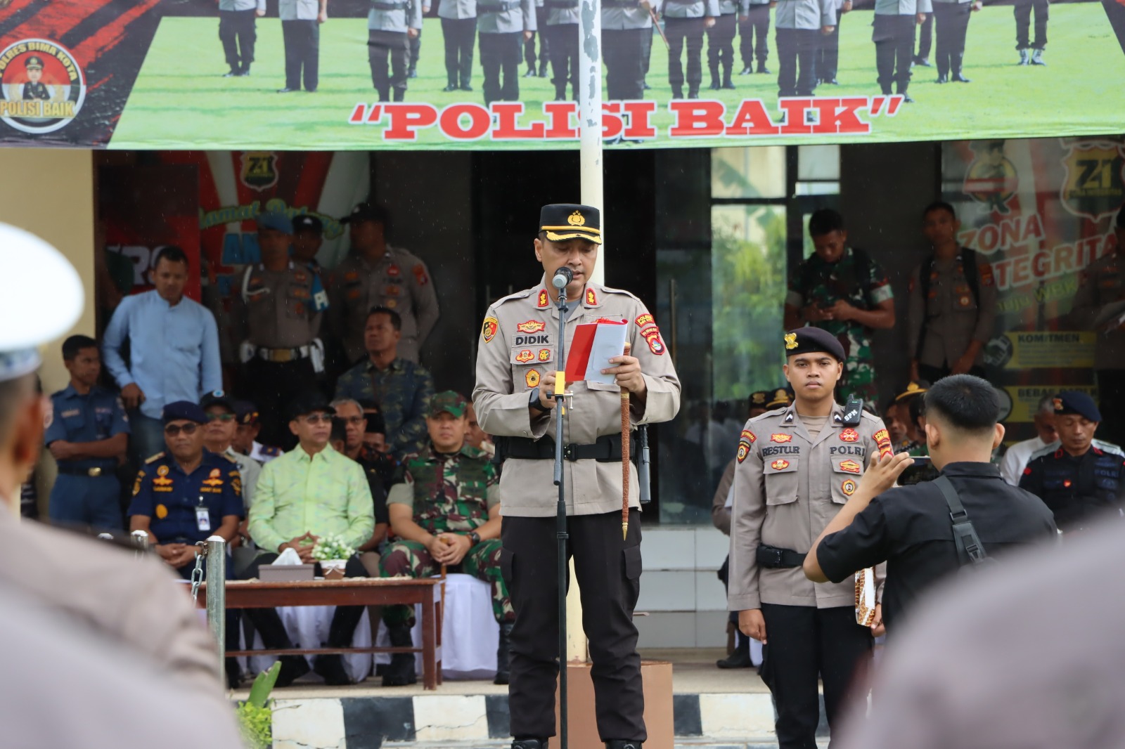 Kota Bima, NTB (20 Maret 2025) – Kapolres Bima Kota AKBP Didik Putra Kuncoro, S.I.K., M.Si., memimpin Apel Gelar Pasukan Operasi Ketupat Rinjani 2025 dalam rangka pengamanan Idul Fitri 1446 H. Kegiatan ini berlangsung pada Kamis, 20 Desember 2024, pukul 08.00 WITA di Lapangan Presisi Polres Bima Kota.