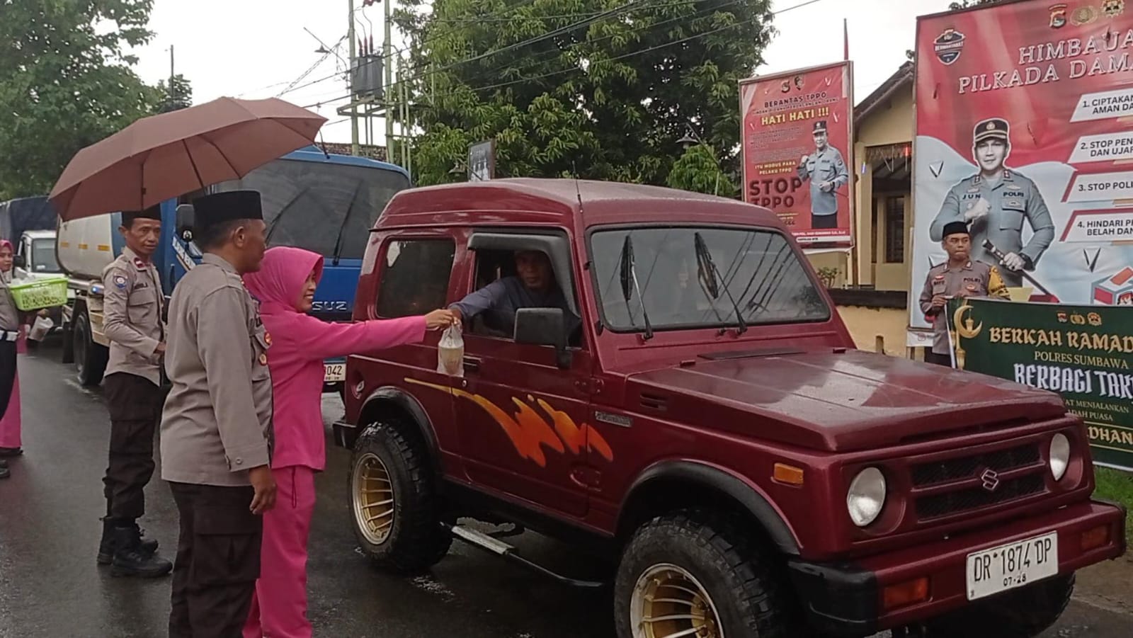 Takjil yang terdiri dari makanan dan minuman dibagikan kepada warga yang sedang dalam perjalanan menjelang waktu berbuka puasa. Kegiatan ini bertujuan untuk memberikan kemudahan bagi umat Muslim yang sedang berpuasa serta mempererat hubungan silaturahmi antara Polri dan masyarakat.