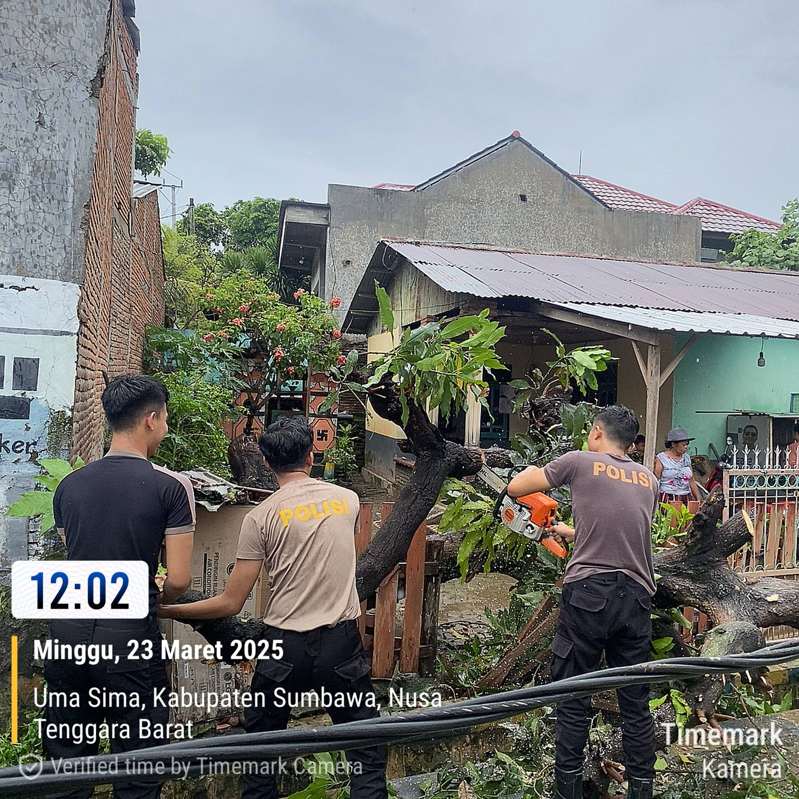 Sumbawa Besar-NTB, Personel Sat Samapta Polres Sumbawa menunjukkan respon cepat dalam menangani pohon tumbang yang terjadi di wilayah Kebayan, Kelurahan Uma Sima, Sumbawa, pada Minggu (23/03/2025) sekitar pukul 11.25 WITA. Kejadian tersebut menyebabkan pagar rumah warga tertimpa dan kabel listrik ikut tertarik.