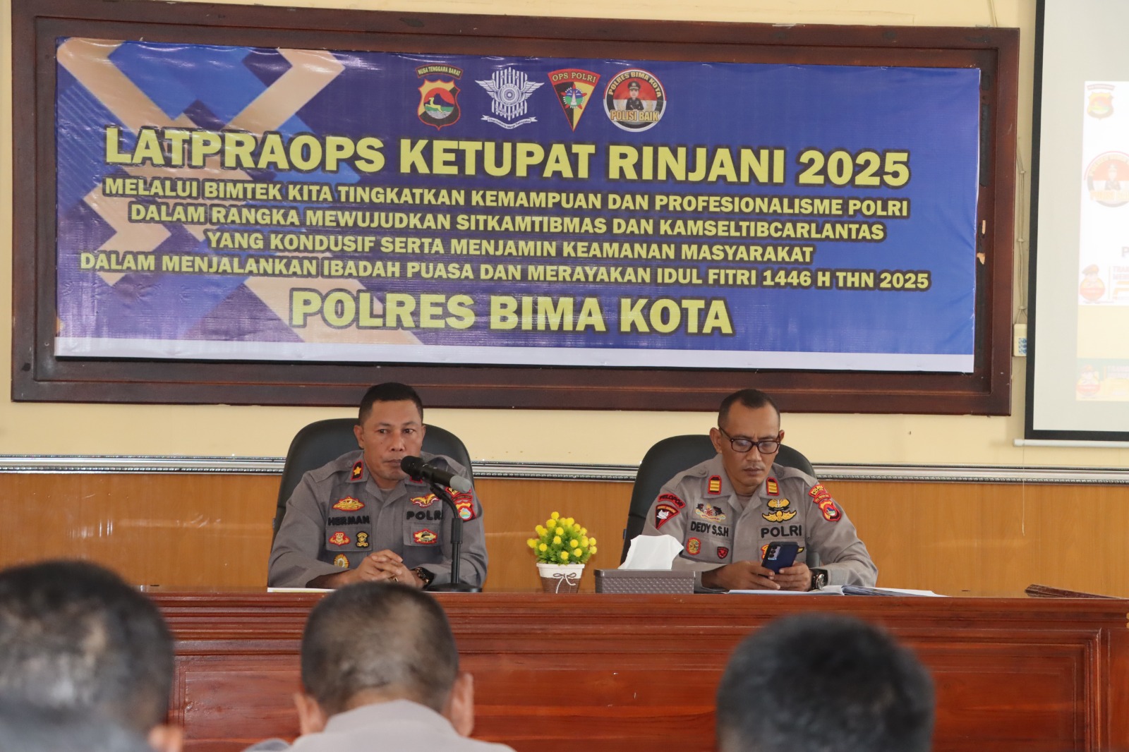Kota Bima, NTB (26 Maret 2025) – Dalam rangka menjamin keamanan dan kelancaran perayaan Idul Fitri 1446 H, Polres Bima Kota menggelar Latihan Pra Operasi (Latpraops) Ketupat Rinjani 2025. Kegiatan ini dipimpin oleh Waka Polres Bima Kota, KOMPOL Herman, S.H., didampingi Kabag Ops Polres Bima Kota, AKP Dedy Supriyadi, S.H. Latihan ini dihadiri oleh Pejabat Utama (PJU) Polres Bima Kota serta seluruh personel yang terlibat dalam Operasi Ketupat Rinjani 2025. Acara berlangsung di Aula Rupatama Polres Bima Kota pada Selasa (25/3/2025).