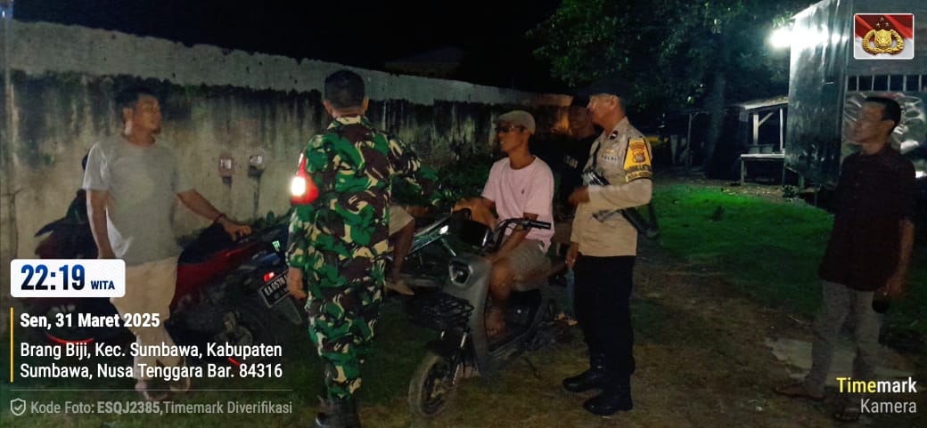 Sumbawa Besar-NTB, Personel gabungan dari Polsek Sumbawa dan Koramil Sumbawa melaksanakan patroli malam bersama di wilayah Kecamatan Sumbawa, Senin (31/03/25)