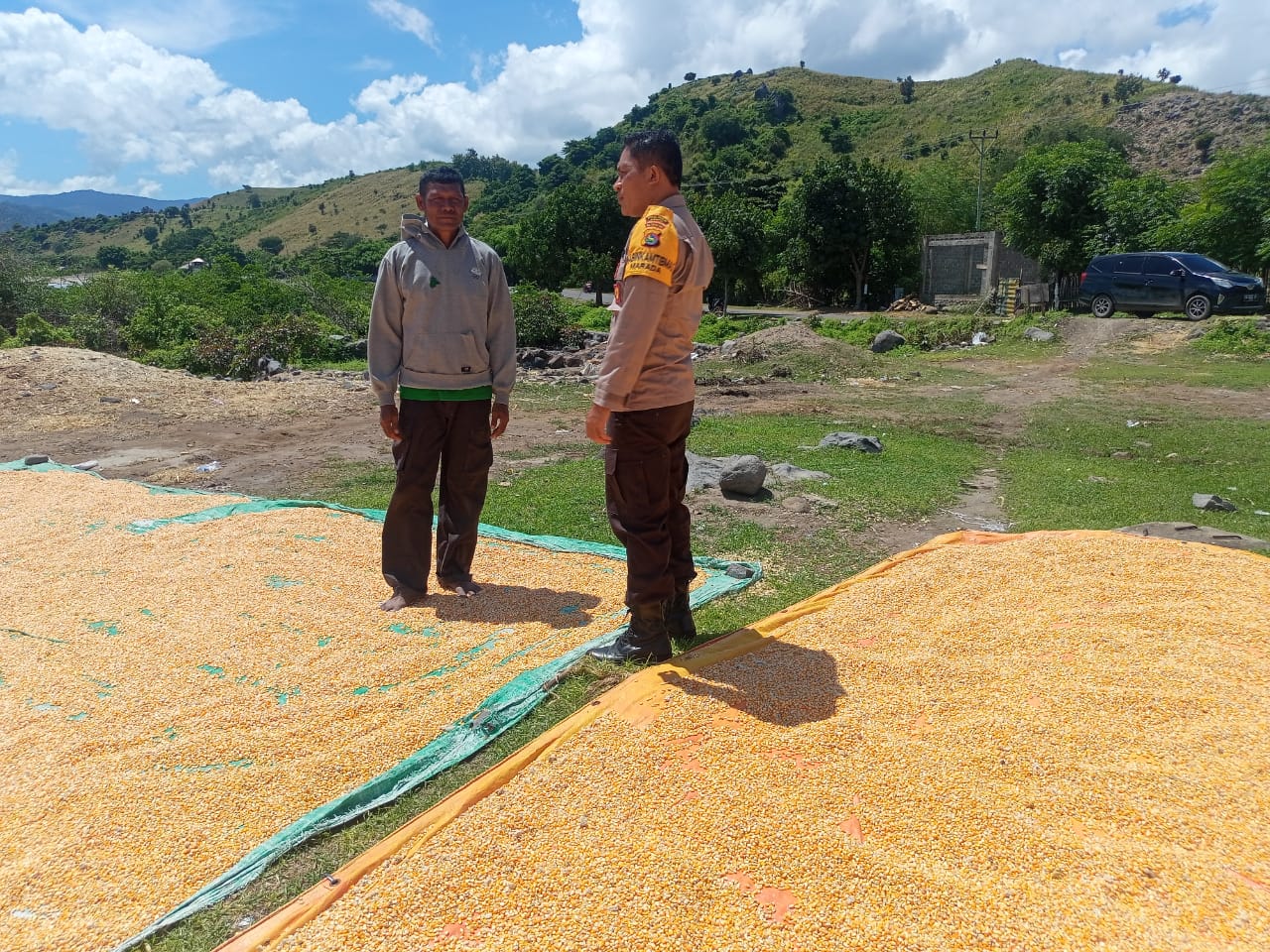 Sebagai bentuk dukungan terhadap program pemerintah dalam memperkuat Ketahanan Pangan Nasional menuju Indonesia Emas 2024, Bhabinkamtibmas Desa Marada, Polsek Hu’u, AIPDA Julkifli melaksanakan kegiatan pemantauan terhadap warga binaannya yang sedang menjemur hasil panen jagung, pada Sabtu, 5 April 2025 pukul 10.00 WITA di Soo Nanga Nteko, Desa Marada, Kecamatan Hu’u, Kabupaten Dompu.