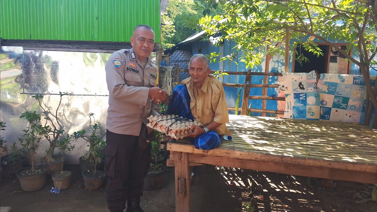 Sumbawa Besar-NTB, Bripka Suwadi, Bhabinkamtibmas Desa Mapin Beru dari Polsek Alas Barat, menunjukkan kepeduliannya terhadap warga binaan dengan memberikan bantuan sembako berupa satu tre telur kepada seorang lansia yang mengalami kekurangan ekonomi, Senin (14/04/25).
