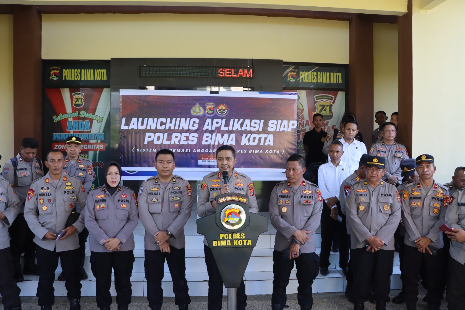 Peluncuran aplikasi berlangsung di halaman Mako Polres Bima Kota dan dipimpin langsung oleh Kapolres Bima Kota, AKBP Didik Putra Kuncoro, S.I.K., M.Si., serta dihadiri para pejabat utama dan puluhan personel dari berbagai satuan.