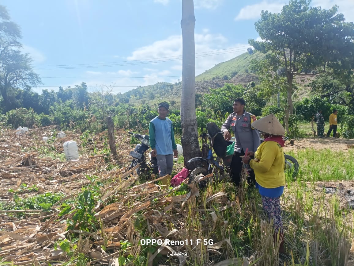 Bhabinkamtibmas Desa Adu Polsek Hu’u, BRIGADIR Wahyudin, melaksanakan pemantauan terhadap aktivitas pertanian warga binaannya, Ibrahim, yang sedang menjemur jagung hasil panen di wilayah Soo Ndahu, Desa Adu, Kecamatan Hu’u, Kabupaten Dompu, pada Sabtu (19/4/2025) pukul 09.00 WITA.