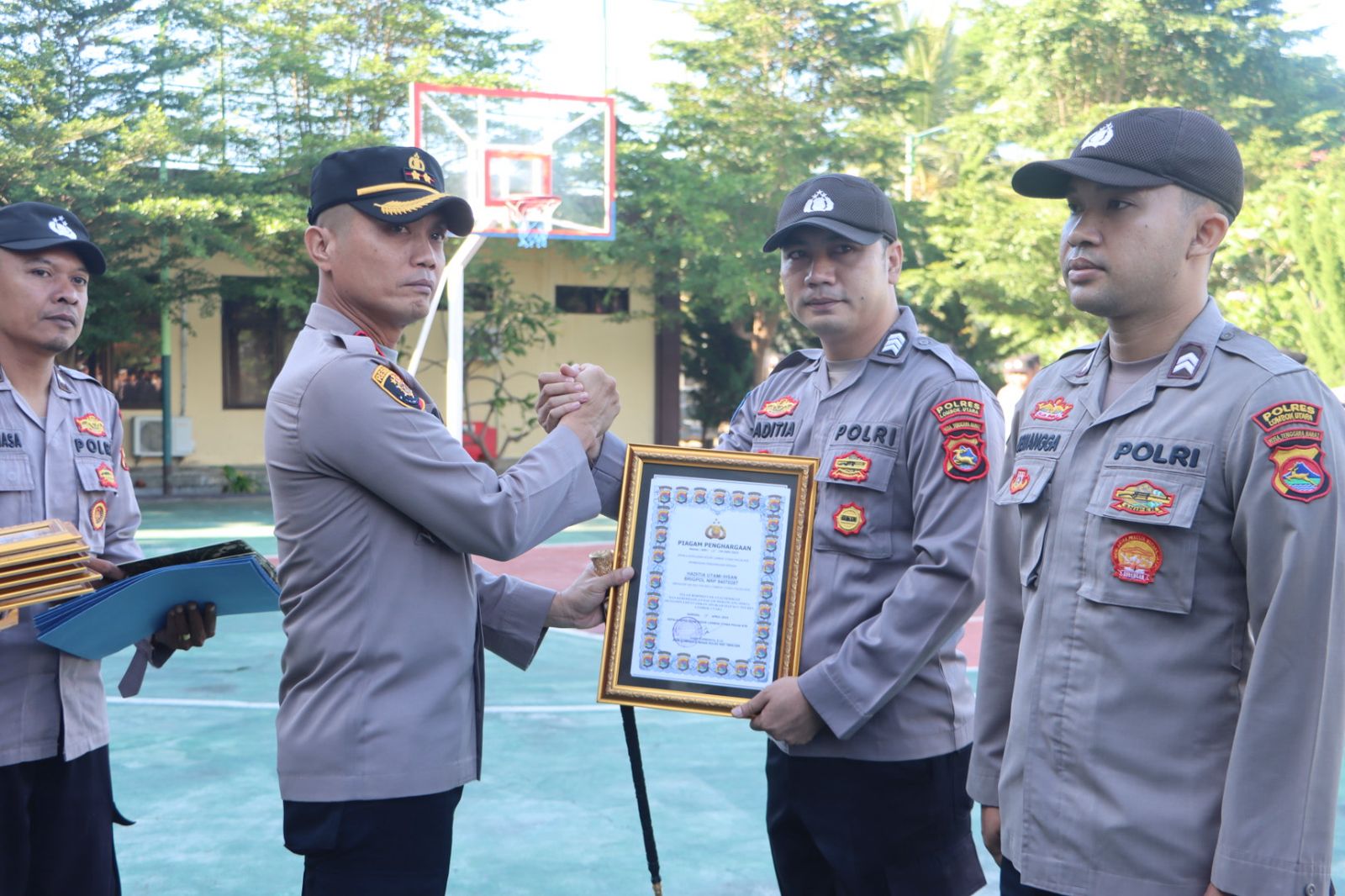 Lombok Utara – Kapolres Lombok Utara AKBP Agus Purwanta S.I.K. pimpin Apel pemberian penghargaan kepada 7 orang anggotanya yang berprestasi dalam melaksanakan tugas pokok fungsi maupun ide cemerlang dalam pembuatan aplikasi pengaduan masyarakat berbasis digitalisasi melalui barcode. yang bertempat di lapangan apel Tatag Trawang Tungga Polres Lombok Utara, Senin, 21/4/2025.