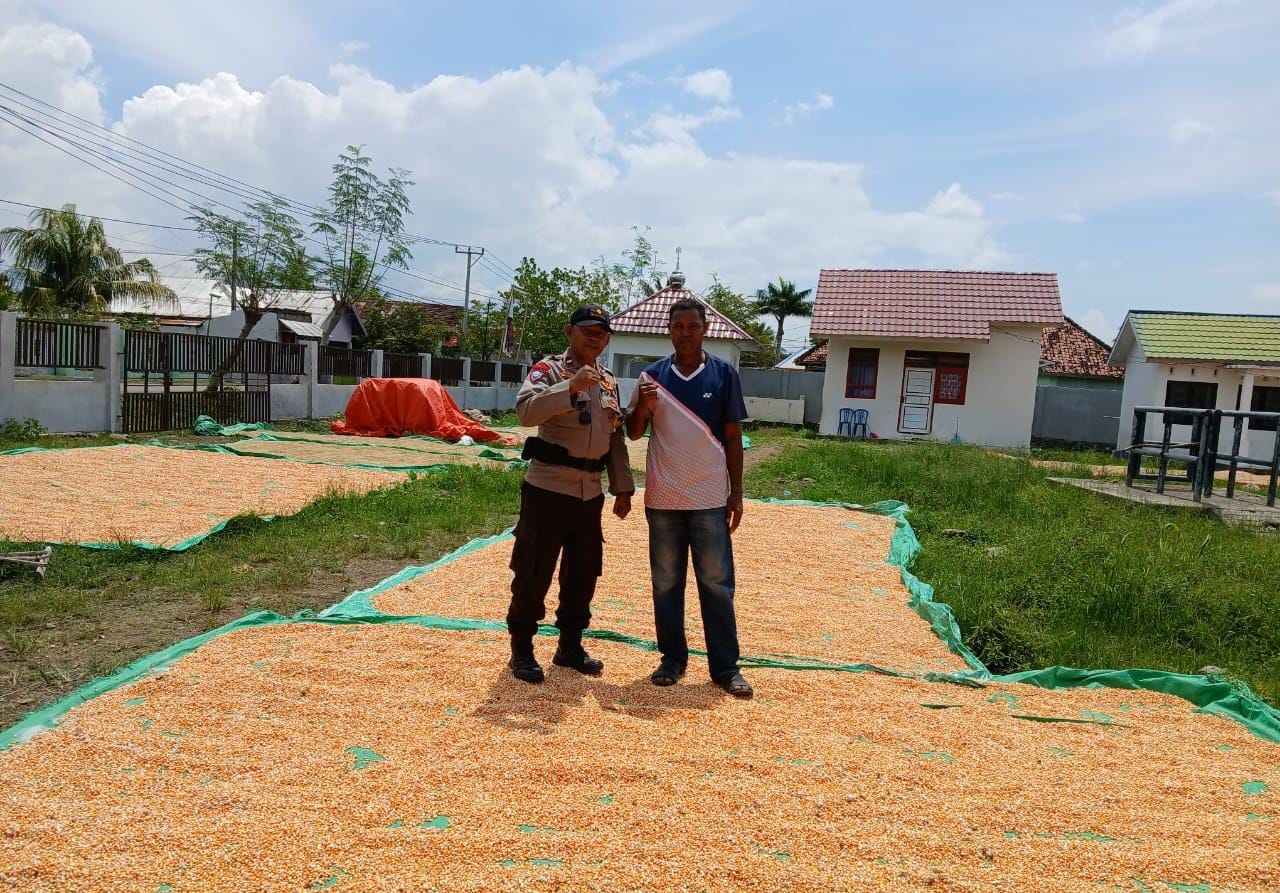 Ju.mat siang 25 April 2025 Bhabinkamtibmas Polsek Woha Polres Bima Polda NTB Aipda M.Saleh menyambangi dan membantu proses penjemuran jagung milik warga di wilayah Binaannya.