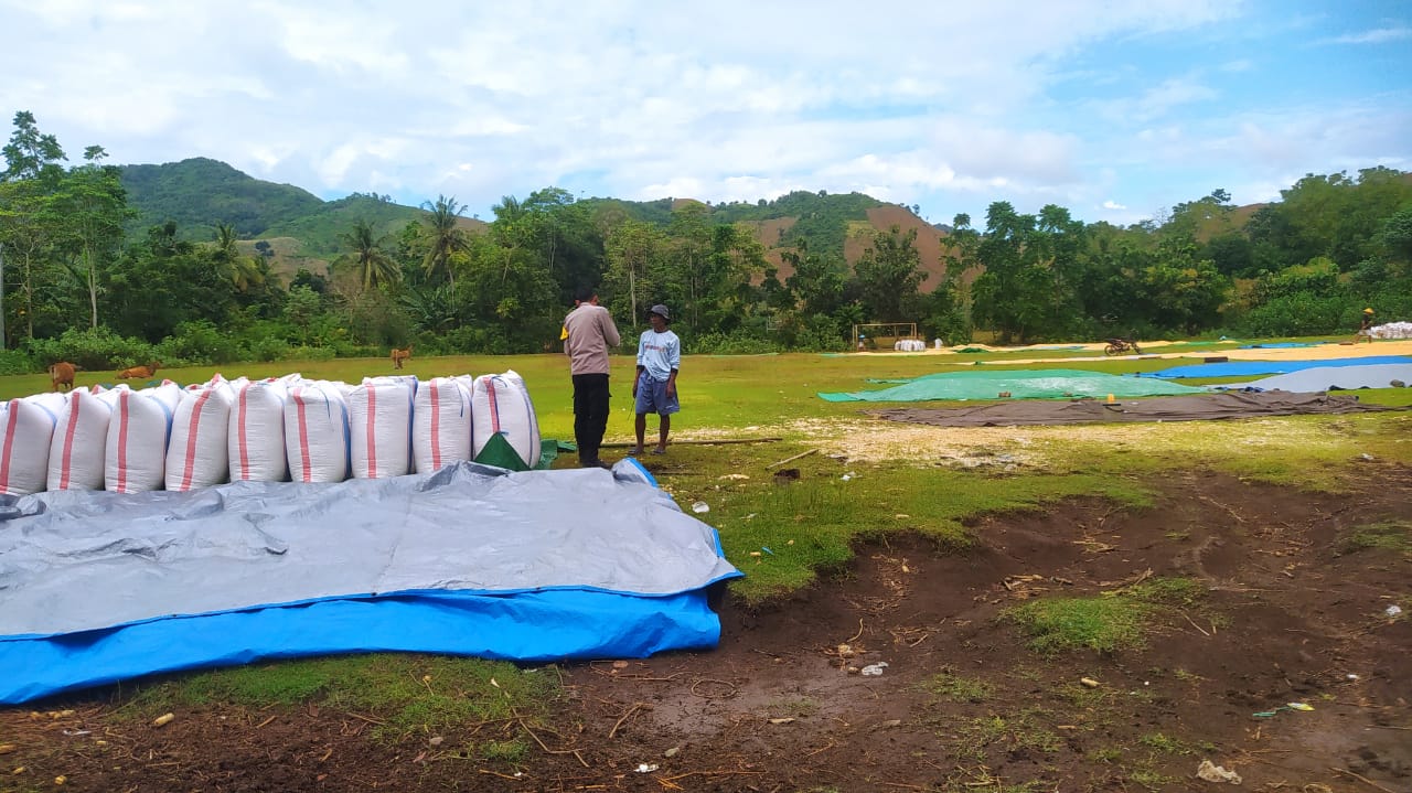 Dalam kesempatan tersebut, Bhabinkamtibmas Desa Batu Putih, Bripka Alfian tidak hanya memantau proses pengeringan jagung, namun juga menyampaikan pesan-pesan kamtibmas kepada petani.