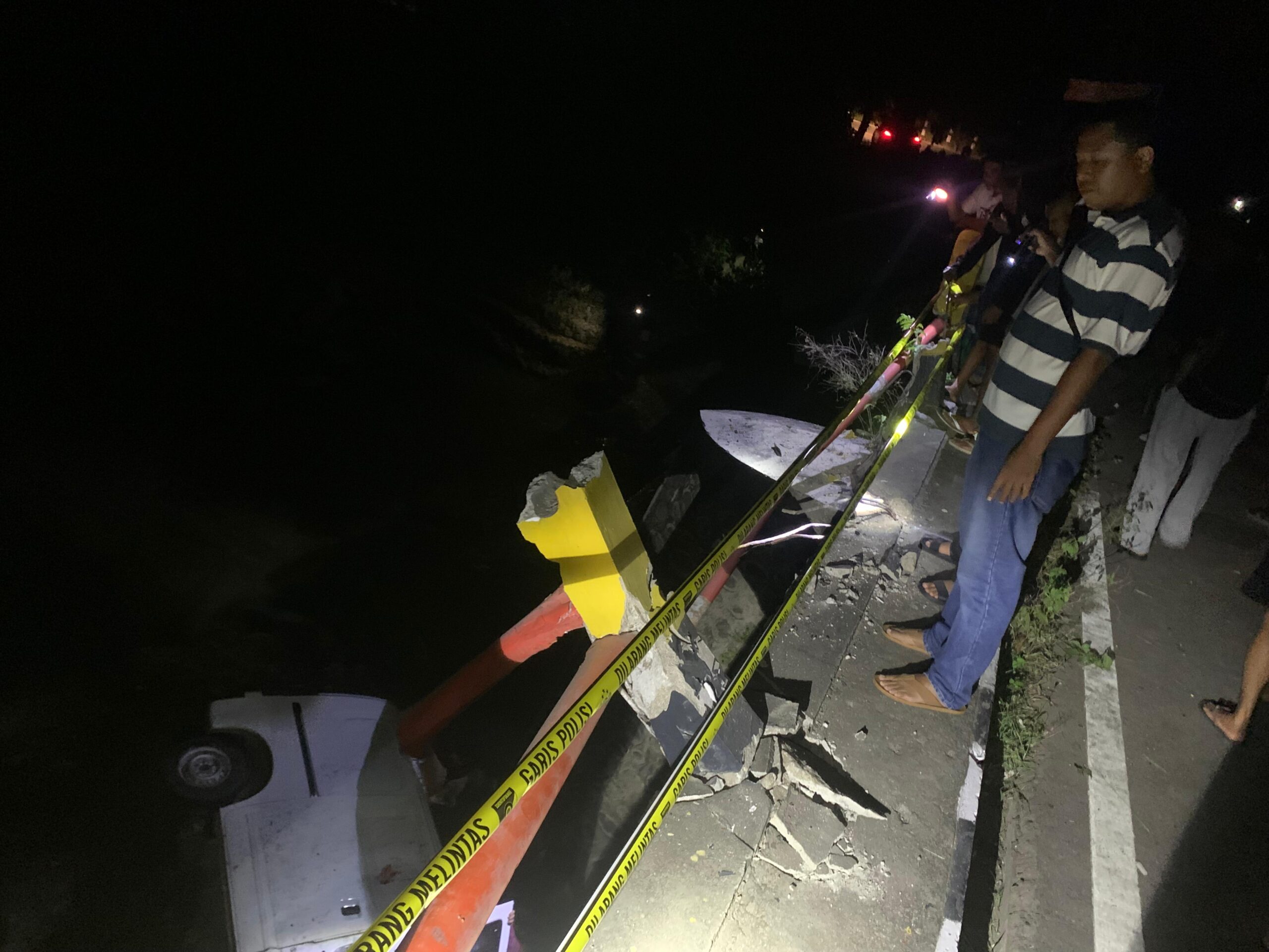 “Kondisi jalan yang sedikit berpasir ditambah kecepatan tinggi membuat pengemudi kehilangan kendali. Akibatnya, kendaraan menabrak pembatas dan terperosok ke sungai,” jelas Kapolsek.