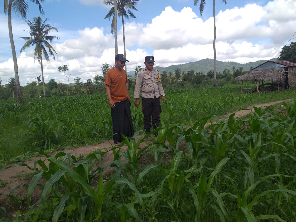 Selain DDS, Bhabinkamtibmas juga melakukan pemantauan progres pertumbuhan jagung hibrida merk Pioner di lahan milik Rumawit.