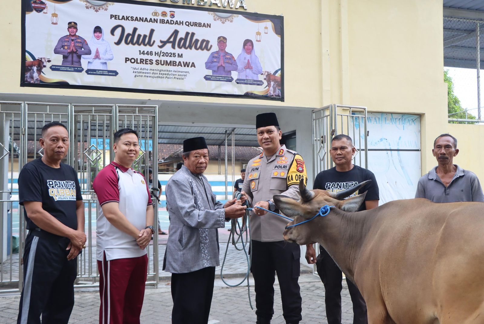 Sumbawa Besar–NTB, Suasana kebersamaan dan suka cita menyelimuti Lapangan Polres Sumbawa. Dalam rangka merayakan Hari Raya Idul Adha 1446 H, Polres Sumbawa melaksanakan penyembelihan hewan kurban sebanyak 9 ekor sapi dan 7 ekor kambing.