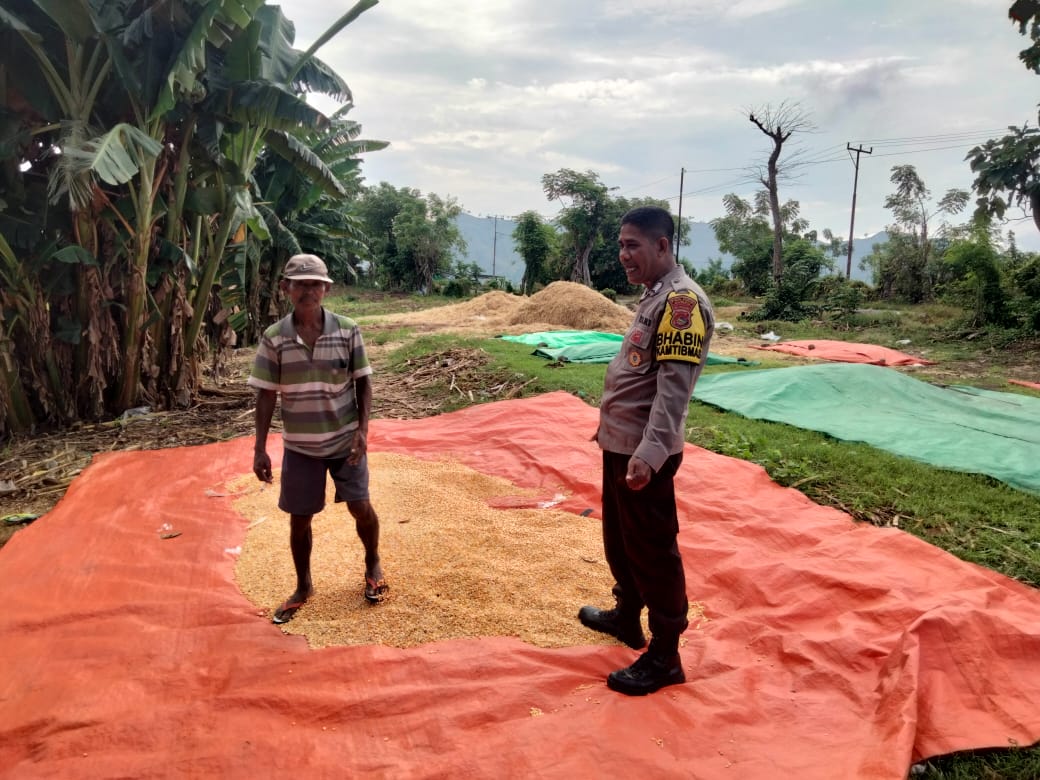Kegiatan berlangsung pada sekitar pukul 09.40 Wita di So Nari Monca, Desa Cempi Jaya, Kecamatan Hu’u, Kabupaten Dompu. Dalam kesempatan tersebut, BRIPKA Ismail memantau secara langsung proses penjemuran jagung hasil panen milik warga setempat, Sdr. Muhammad.