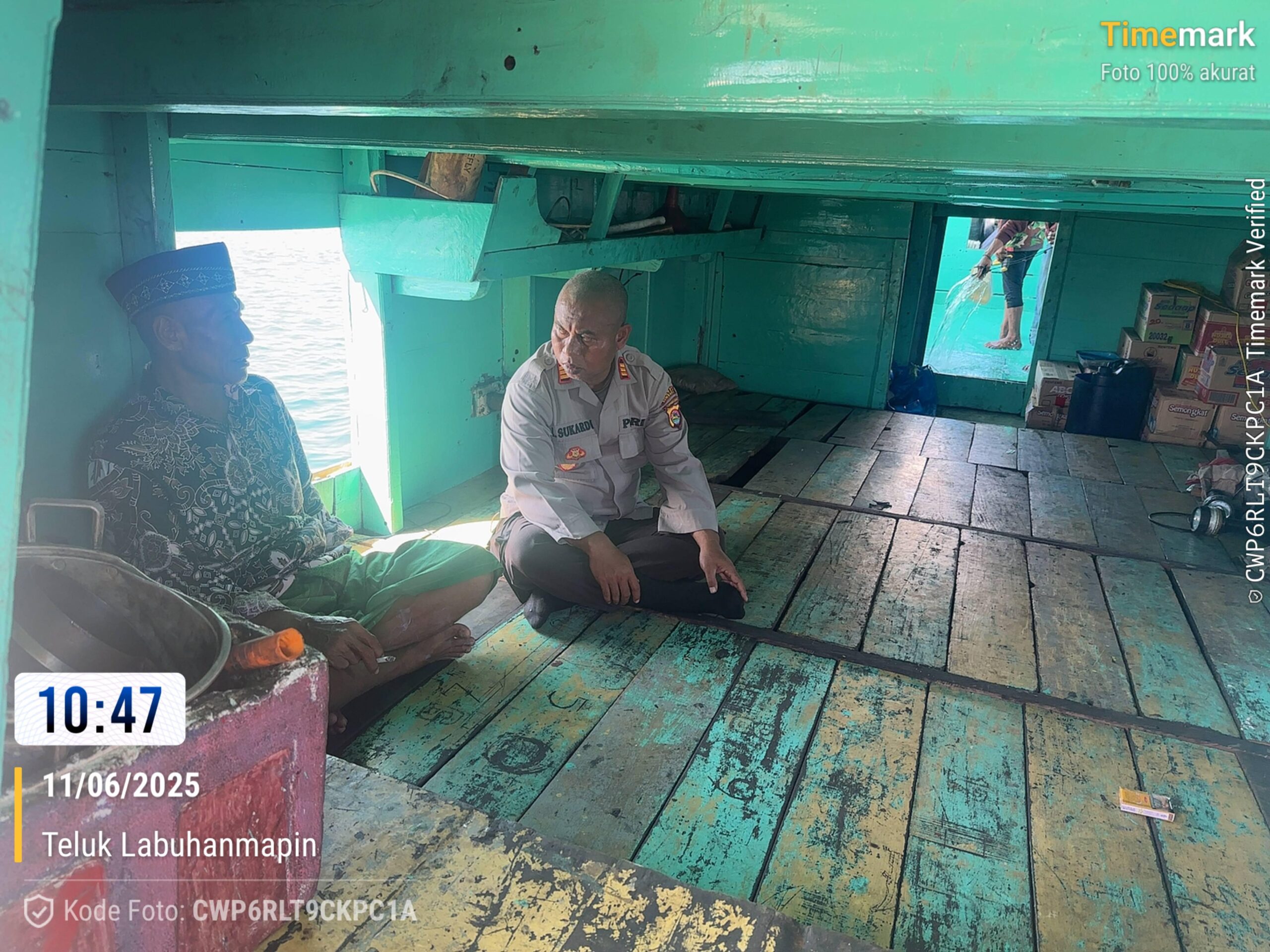 Kapolsek Alas Barat bersama anggotanya menggunakan kendaraan patroli dinas roda empat untuk menyambangi kapal nelayan Bapak Herman di pesisir pantai Labuhan Mapin. Kunjungan ini bertepatan dengan kegiatan zikir yang dilakukan para nelayan sebelum berangkat melaut mencari ikan.