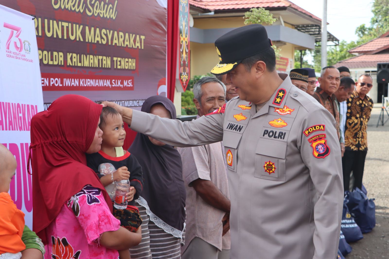 Didampingi oleh Ketua Bhayangkari Daerah Kalteng, Ny. Maya Iwan Kurniawan, Irwasda Kombes Pol Dr. Benny G. Sudjana, dan jajaran Pejabat Utama (PJU) Polda, serta Kapolres Mura AKBP Franky M. Monathen, S.I.K. Kapolda langsung melaksanakan bakti sosial dengan menyerahkan bantuan sosial kepada Purnawirawan Polri, Stunting dan masyarakat Murung Raya.