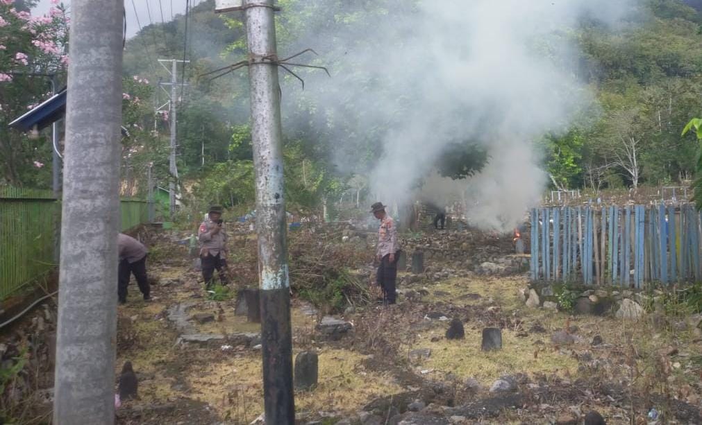 Bertempat di Desa Sie Kecamatan Monta Kabupaten Bima dengan pakaian kostum lengkap Kapolsek dan anggotanya tidak canggung untuk membersihkan atau membenahi kuburan di TPU Desa Sie.