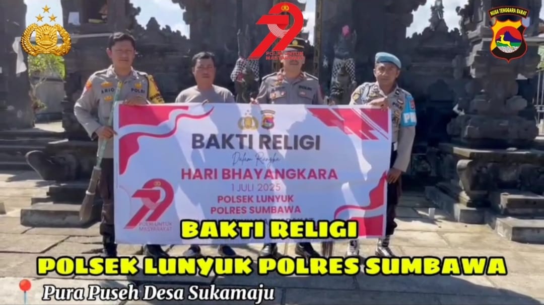 Sumbawa Besar–NTB, Dalam rangka menyambut dan memperingati Hari Bhayangkara ke-79, personel Polsek Lunyuk melaksanakan kegiatan Bhakti Religi pada Minggu, 22 Juni 2025. Kegiatan bersih-bersih ini dipusatkan di Pura Puseh, Desa Suka Maju, Kecamatan Lunyuk, Kabupaten Sumbawa, dimulai pukul 11.30 WITA hingga selesai.
