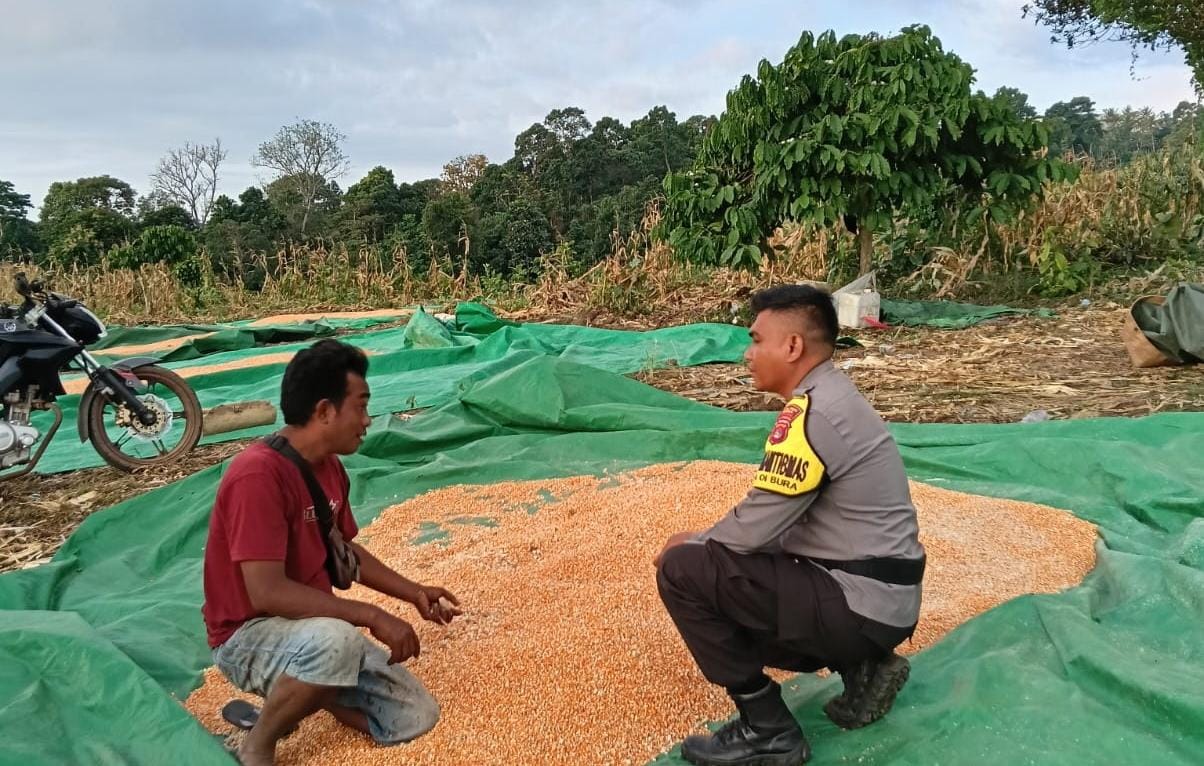 Bhabinkamtibmas Polsek Tambora Polres Bima Polda NTB membantu menjemur jagung warga binaan di Desa Oi bura Kecamatan Tambora Kabupaten Bima.