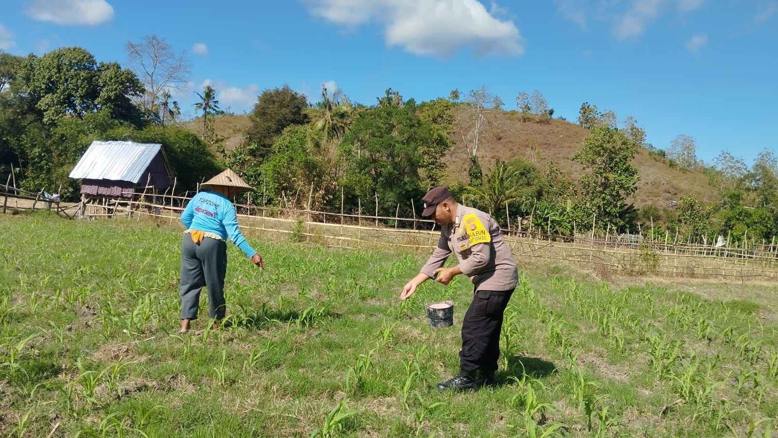 Dalam rangka mendukung program ketahanan pangan nasional, Bhabinkamtibmas Desa Ta’a, Polsek Kempo, BRIPKA Ibrahim melaksanakan kegiatan pendampingan kepada warga yang tengah melakukan pemupukan tanaman jagung di lahan pertanian milik warga.