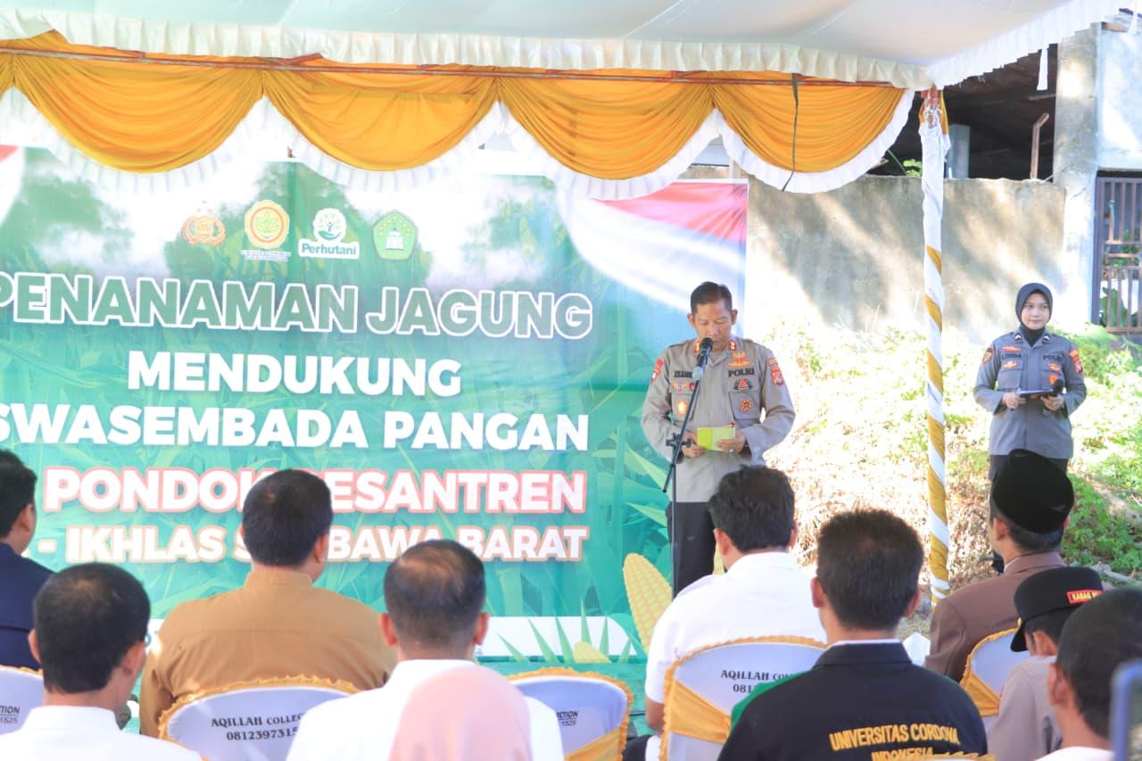 Sumbawa Barat, NTB — Dalam upaya memperkuat ketahanan pangan nasional sekaligus menumbuhkan semangat kemandirian ekonomi di lingkungan pesantren, Kapolres Sumbawa Barat AKBP Zulkarnain, S.I.K. memimpin langsung kegiatan penanaman jagung di lahan milik Pondok Pesantren Al-Ikhlas yang terletak di lingkungan Menala, Kecamatan Taliwang, Kabupaten Sumbawa Barat, pada Rabu (6/8).