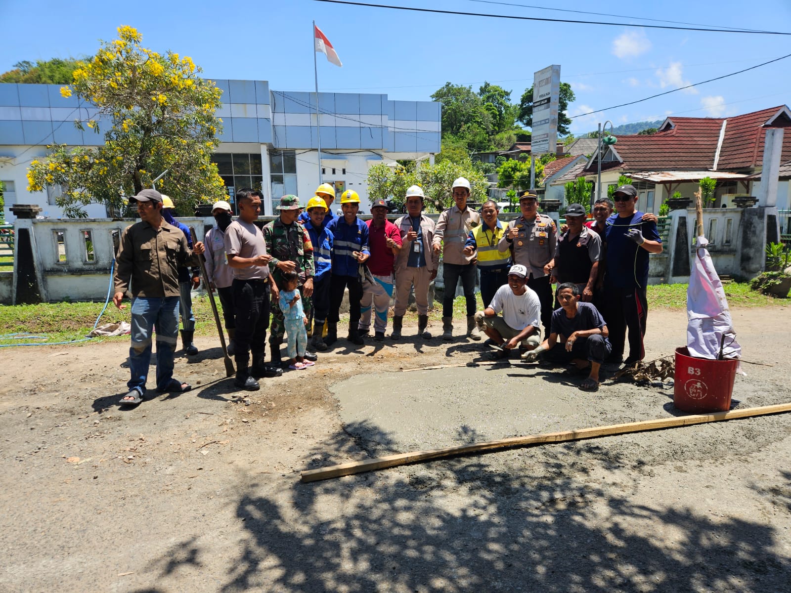Perbaikan jalan dilakukan sebagai bentuk kepedulian terhadap kondisi ruas jalan yang mengalami kerusakan dan mengganggu kelancaran arus lalu lintas maupun aktivitas masyarakat. Kegiatan dimulai dengan pembersihan area sekitar jalan oleh personel Polsek Sekongkang dan warga. Selanjutnya, pihak pt amman membawa perlengkapan teknis seperti mesin stamper, cangkul, sekop, serta material berupa pasir dan semen.