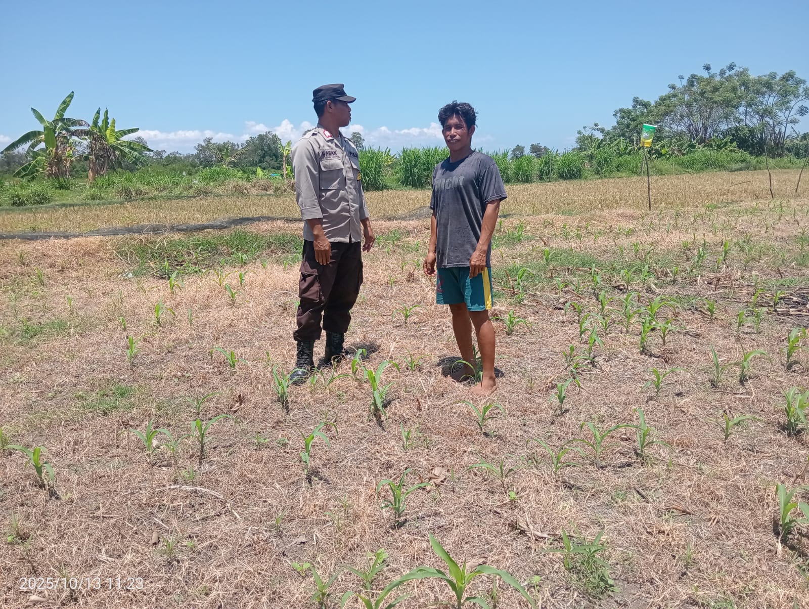 Dalam rangka mendukung Program Ketahanan Pangan Nasional menuju Indonesia Emas 2025, Bhabinkamtibmas Desa Nangakara Polsek Pekat Bripka Wawan melaksanakan kegiatan sambang dan pemantauan lahan pertanian milik warga pada Senin, 13 Oktober 2025, sekitar pukul 11.00 Wita bertempat di Dusun Nangakara, Desa Nangakara, Kecamatan Pekat, Kabupaten Dompu.