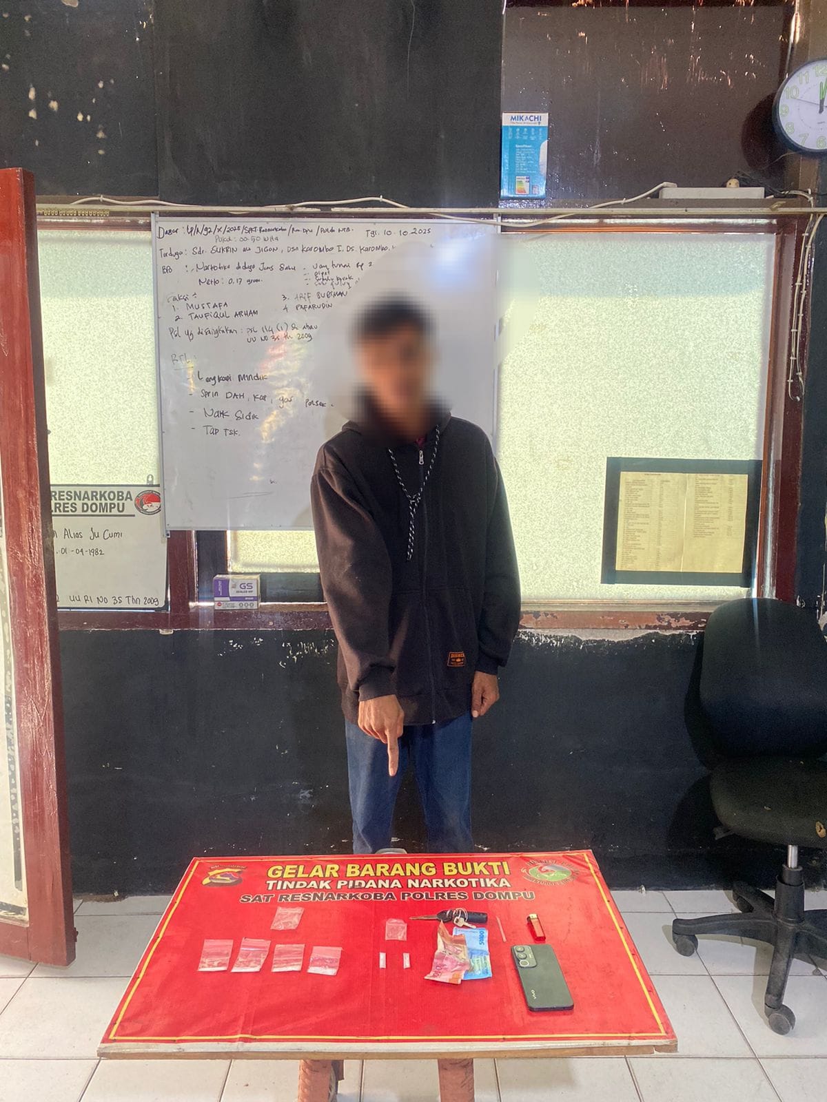 Satuan Reserse Narkoba Polres Dompu kembali menunjukkan komitmennya dalam memberantas peredaran gelap narkotika. Seorang pria berinisial A (28 tahun), warga Desa Nangamiro, Kecamatan Pekat, berhasil diringkus saat diduga tengah menunggu transaksi sabu di pinggir jalan Dusun Kaliaga II, Desa Kadindi Barat, Kecamatan Pekat.